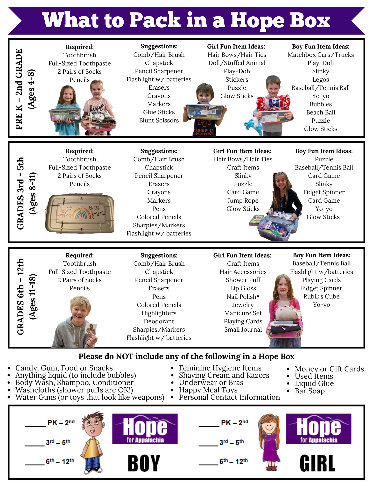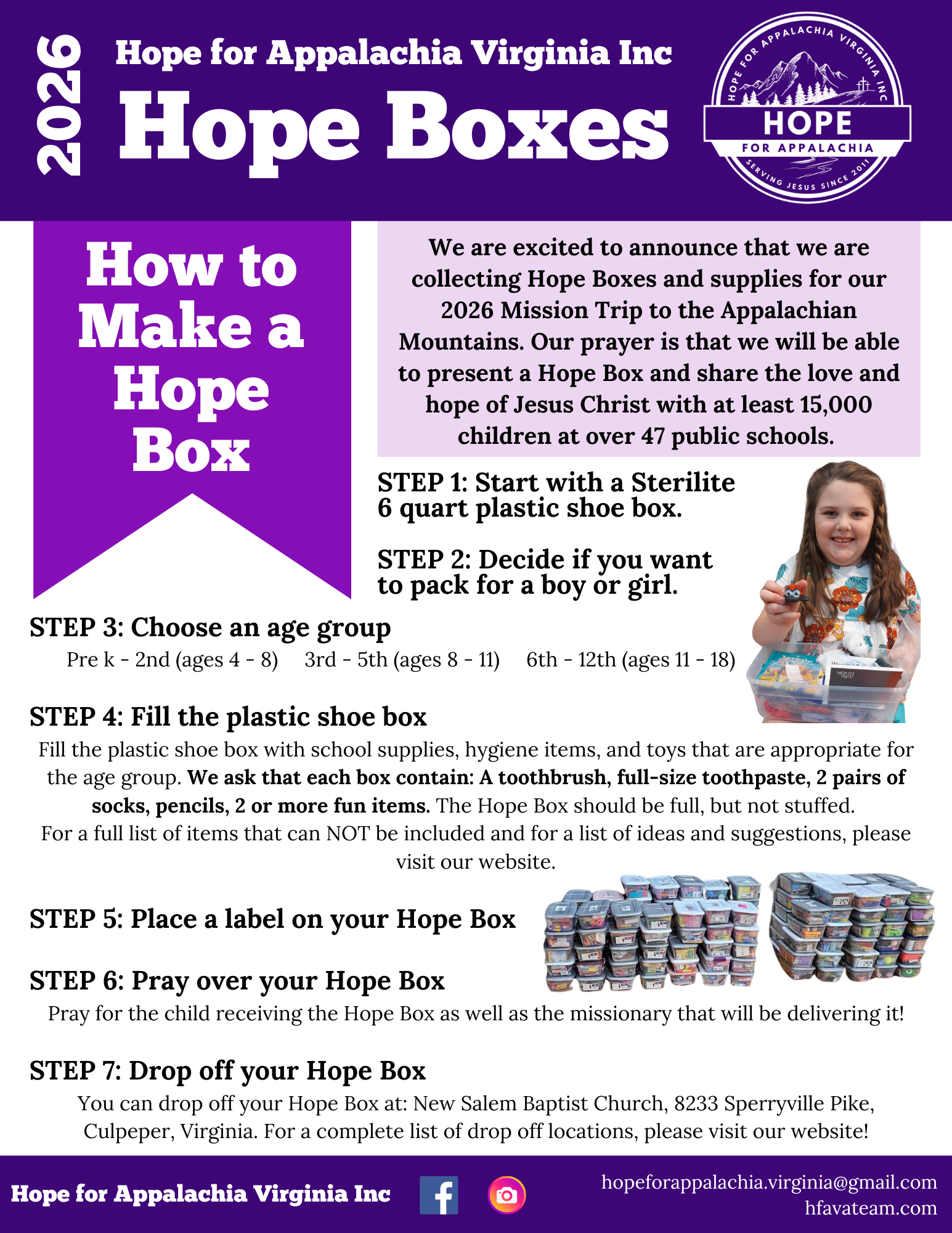 We are excited to announce that we are collecting Hope Boxes and supplies for our 2026 mission trip to the Appalachian Mountains. Our prayer is that we will be able to present a Hope Box and share the love and hope of Jesus Christ with at least 15,000 children at over 47 public schools.