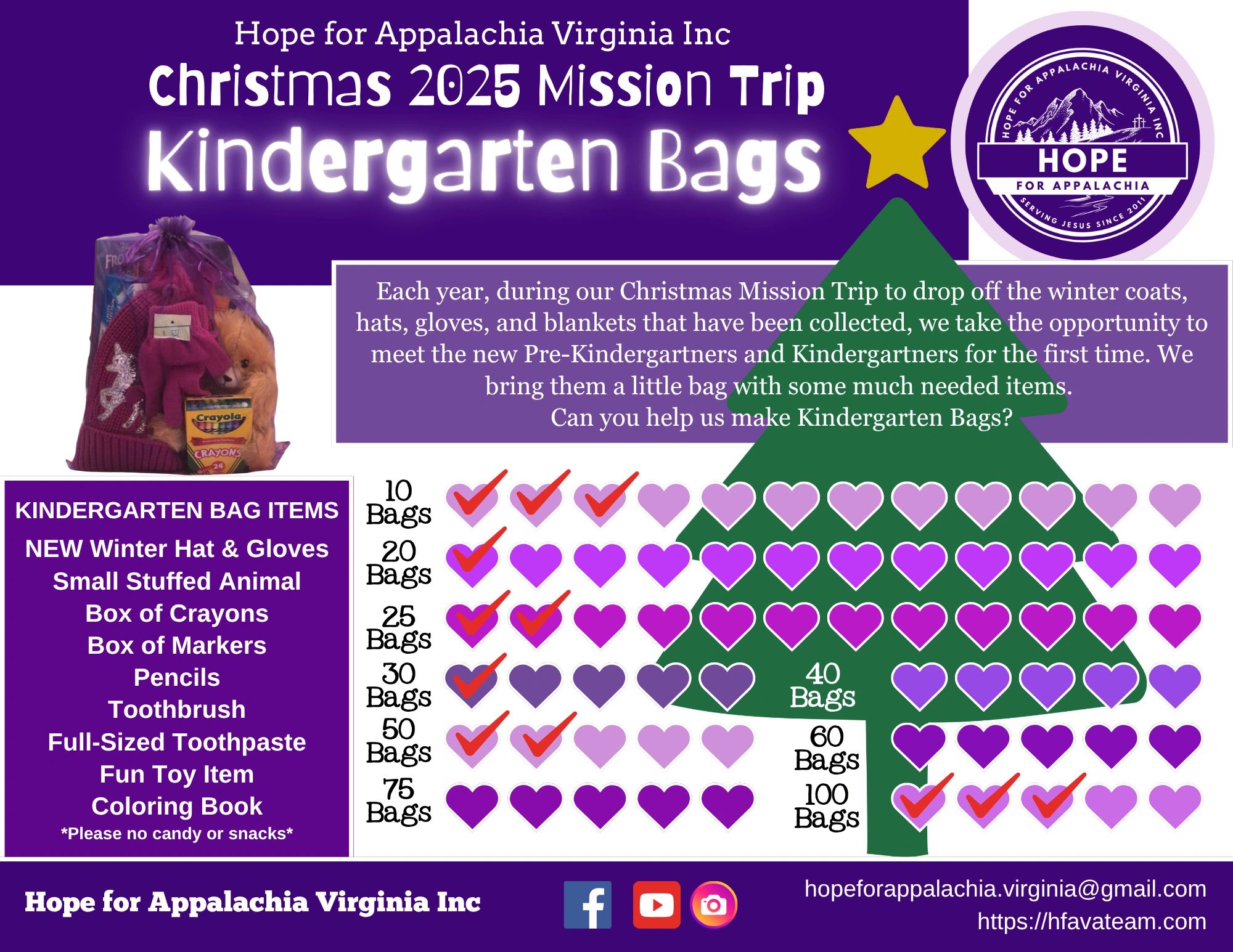 Each year, during our Christmas Mission Trip to drop off the winter coats, hats, gloves, and blankets that have been collected, we take the opportunity to meet the new Pre-Kindergartners and Kindergartners for the first time. We bring them a little bag with some much needed items. Can you help us make Kindergarten Bags?